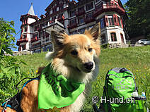 With a full backpack and in a good mood about the great weather we started our route at 7.15 a.m. at Grindelwald station to our starting point Brienz station. Directly from the platform you can reach the lake trail along campgrounds, forest yard and bicycle path in the direction of Giessbach. From this side the lake is already well accessible for dogs and suitable for swimming. Once you reach the other end of the lake, turn right under the motorway bridge and follow the steep tarred road. Here some cars drive, which disturbed us at the beginning. This is already the steepest part of the whole hike. The road leads to the small village Engi, where you have the possibility to eat and drink in a small restaurant with WC. There the trail is also a little bit away from the road, but only a few 100 meters. A little further along the tarred road you quickly reach the turnoff to Giessbach, where you turn right down to the beautiful waterfall and the Grandhotel Giessbach. A true fairy tale castle with a great view of Lake Brienz.