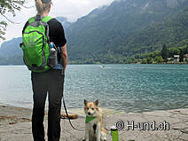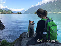 Then follow the hiking trail towards Iseltwald. Here the most beautiful part of the hike begins. A wonderful hiking trail right along the lakeside, with small bays for picnicking and resting with a great view of the panorama. Here well-behaved dogs can run freely, there are no roads nearby. Arrived in the village of Iseltwald, you immediately notice the beautiful Seeburg Castle. Iseltwald is a beautiful, sweet village with many possibilities to eat and drink, and we continue through Iseltwald through beautiful houses and over a lattice bridge towards a meadow landscape. Once again it goes a little steeper up to Sengg. From here, unfortunately, it goes again with a tarred road to Unterschwand in the direction of Bönigen. It is also a car road and also used by cyclists. We have walked the way, but it is getting longer, especially in the heat it is not so pleasant. The dog has not so many possibilities to bathe. As alternative one can go to Bönigen by bus from Sengg. When you arrive in Bönigen, turn right towards the Aare. Here is a small bathing beach, dogs were with us also at the beach. Behind it is a small nature reserve, dogs are not allowed there. The hiking trail leads outside, directly to the Aare and to Interlaken Ost Bahnhof. The last part convinces again with its great bays for the dogs. Altogether we were on the way for a little over 6 hours. Pure walking time about 5. 15 hours. The hike is not marked with the Jakobsweg. Follow the yellow hiking signs. There were two/three crossings with bars.