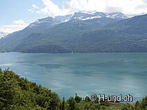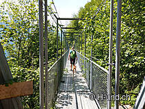 After a restful night and an extensive breakfast, we leave the Eichhof in beautiful weather for Interlaken. After 100m we are already back on the Way of St. James and hike through forests and across meadows - the mountains and Lake Brienz always in view. The path leads us through the beautiful and traditional villages of Hofstetten and Schwanden towards Brienz. Brienz is home to the only full-time violin-making school and the only school of woodcarving in Switzerland. So it is not surprising that since the first kilometre of today we have been encountering sculptures along the way or in the beautiful gardens. The path leads along the lake for some time and then turns right, up into the woods on the steep mountain sides above Brienz. The ascent is pleasant, but with little shade and we start to sweat. Once you have reached the top, the route continues through forests, over alps and meadows - sometimes a bit up, then down again. Remarkably often we cross deep ditches and it is hard to imagine what comes down here during a thunderstorm. About at kilometer 10, at the height of Ebligen, we pass the suspension bridge "Underweidligrabe". Despite the magnificent view from the bridge, it is probably not suitable for all 2- and 4-legged people, but it really starts swinging! The bridge is closed in the months November - March. An alternative route is indicated.